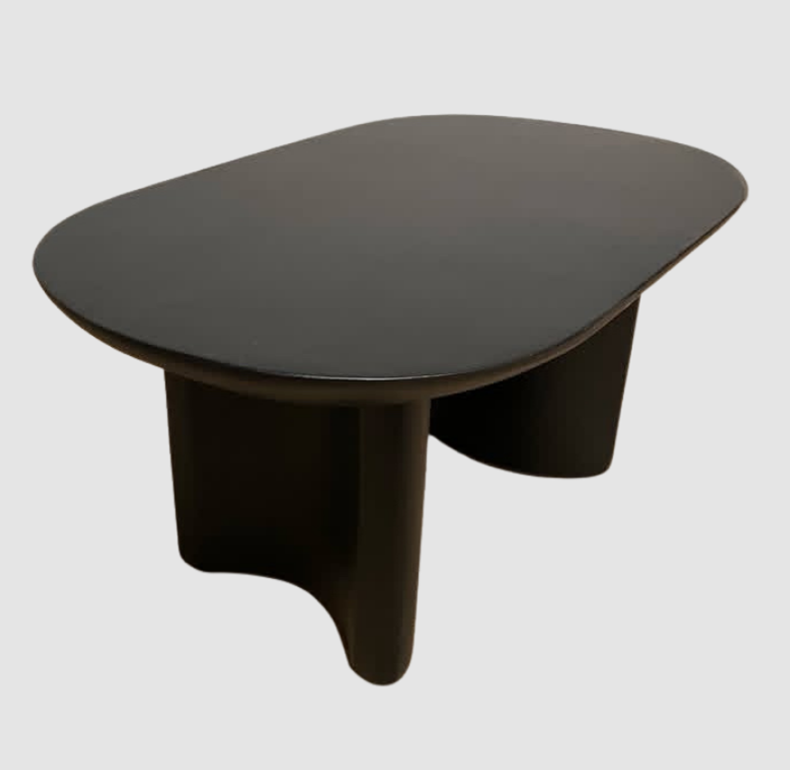 This striking black coffee table features a luxurious woven rattan top that introduces natural texture to its bold, modern form. Its unique, abstract base transforms this piece from simple utility into a captivating sculptural focal point for any living space.