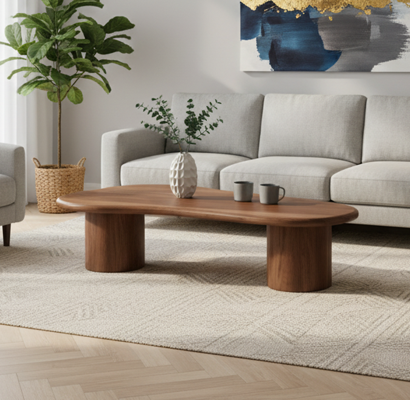 A striking low-profile coffee table featuring a smooth, curved silhouette crafted from polished solid wood and supported by three sturdy cylindrical legs.