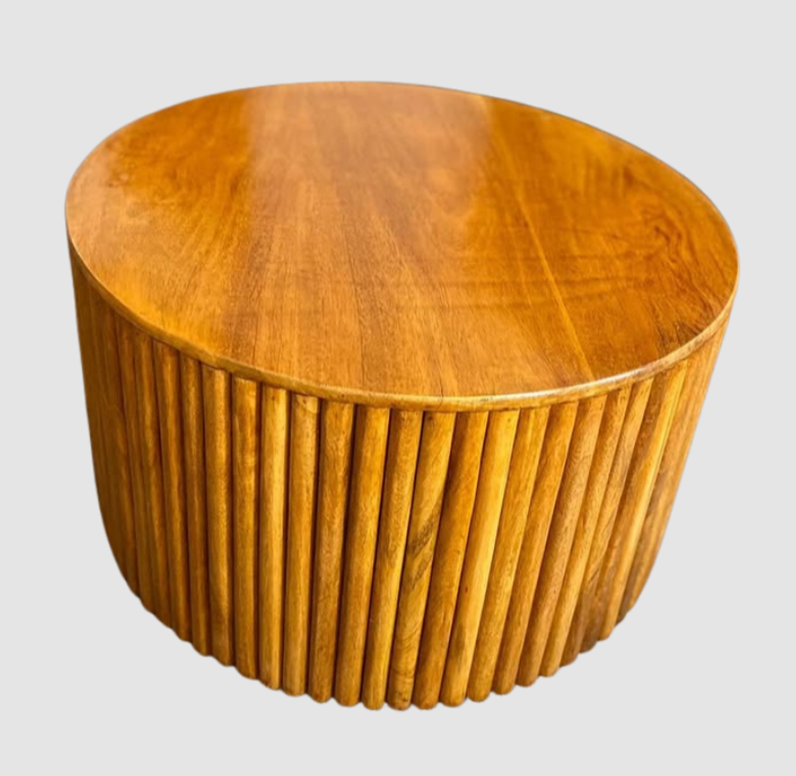 This eye-catching coffee table features a richly-toned natural wood top supported by a dramatically textured base. The unique, vertically fluted drum design introduces captivating depth and warmth, making it a powerful centerpiece in any contemporary or rustic setting.