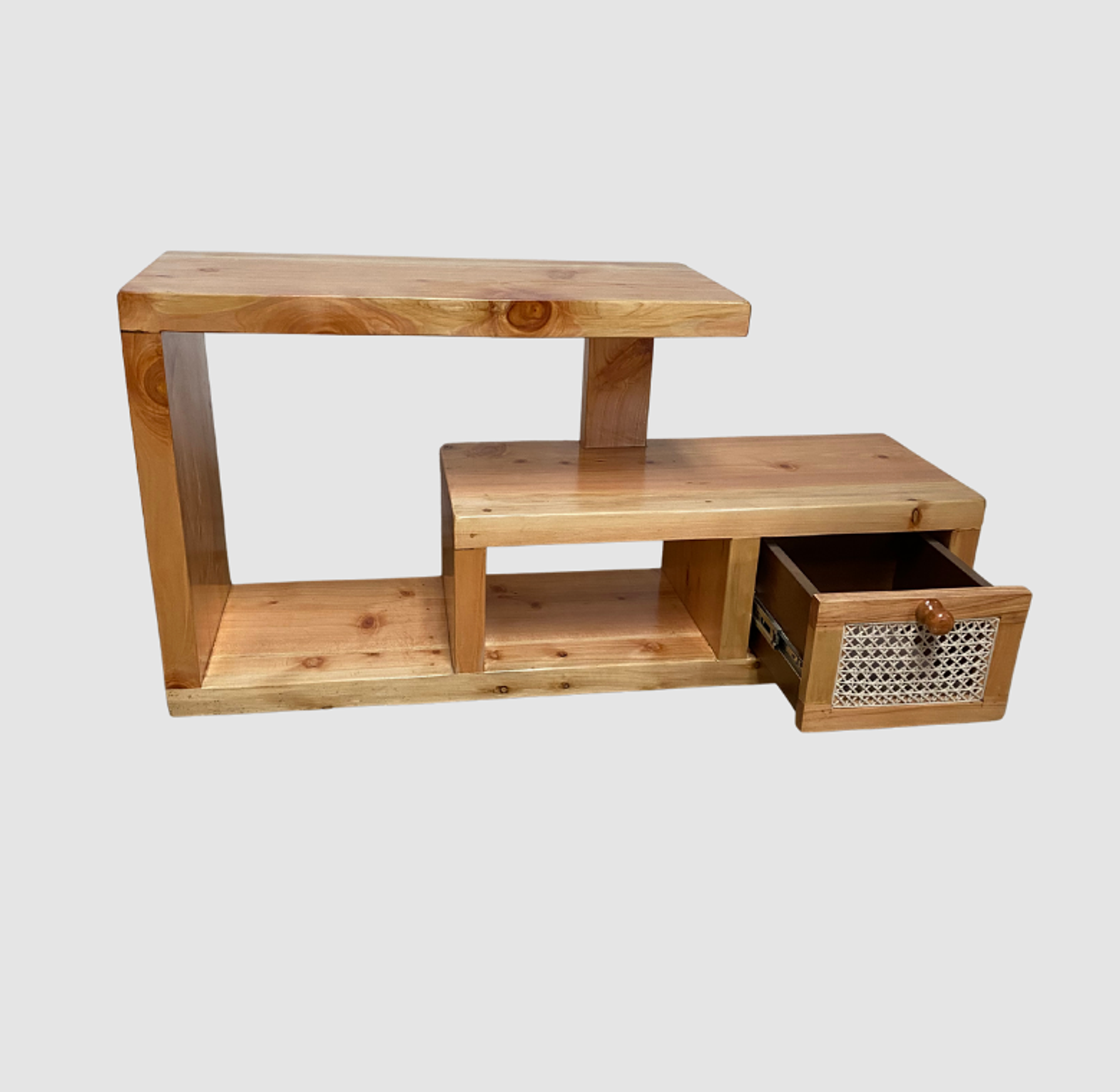 The Minimalist Asymmetrical Accent Table pairs clean geometry with natural charm, featuring interlocking tiers, a light wood finish, and a cane-front drawer for subtle sophistication.