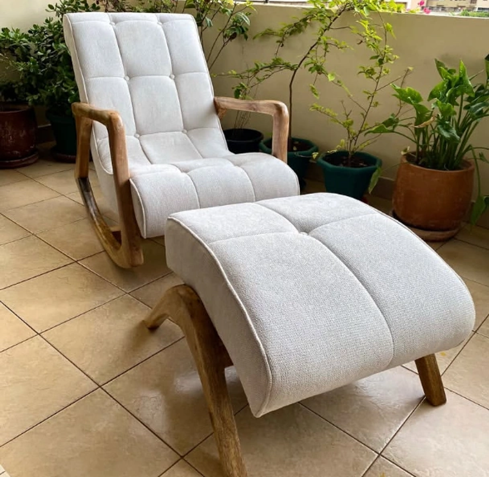 The Plush Rocking Chair & Ottoman set is designed to bring relaxation and warmth into any home. Upholstered in soft, light-colored fabric, this cozy duo offers the perfect blend of comfort and style. The chair’s high back and plush cushions provide excellent support, while the smooth wooden rocking base adds a rustic, natural touch. Accompanied by a matching ottoman, this set is perfect for mums and babies, reading corners, or calm relaxation spaces. With its soothing design and premium comfort, the Plush Rocking Chair & Ottoman transforms everyday moments into peaceful retreats.
