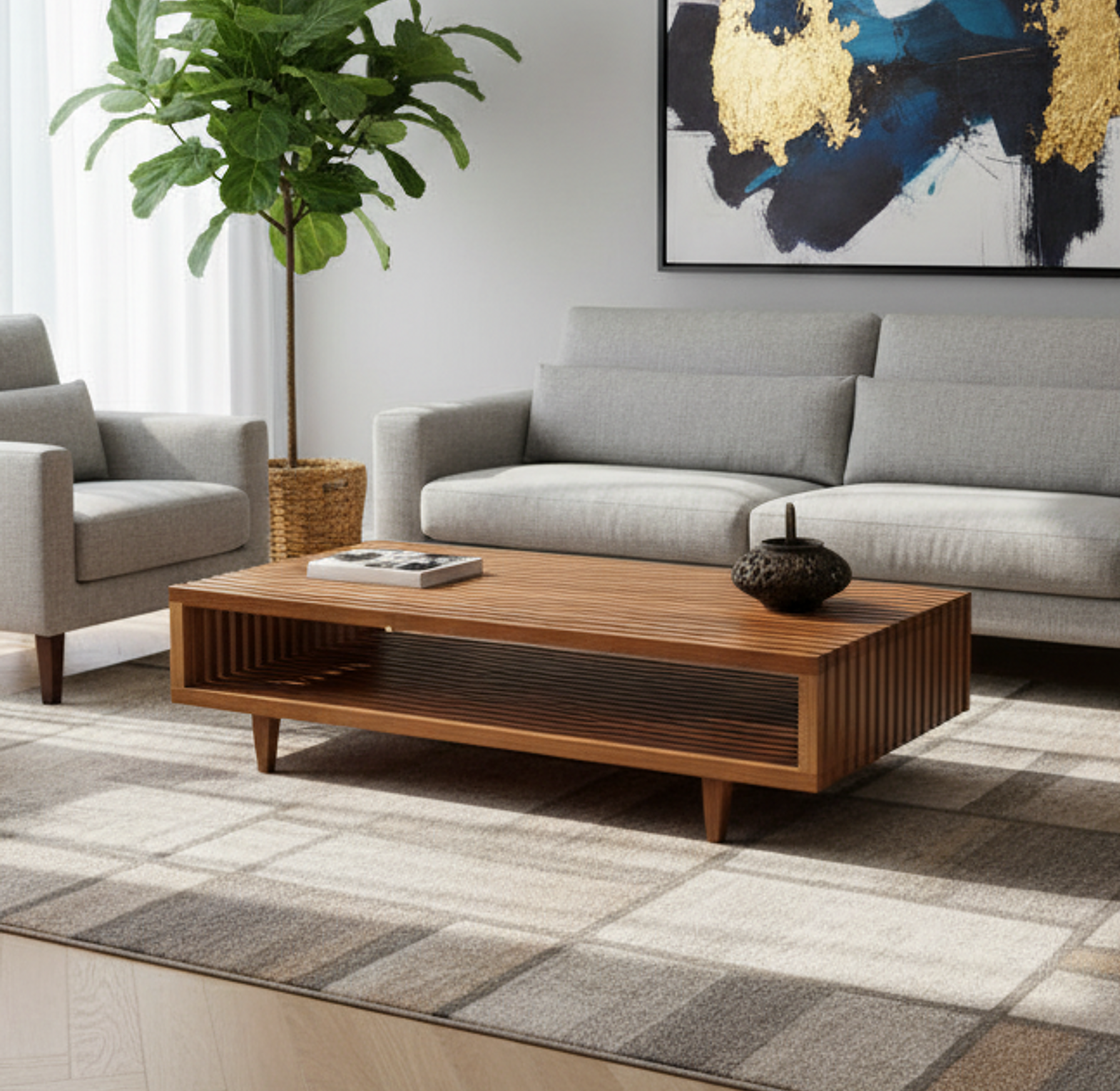 A sleek rectangular table crafted from thin, evenly spaced wooden slats, offering a refined balance of texture, form, and functionality.