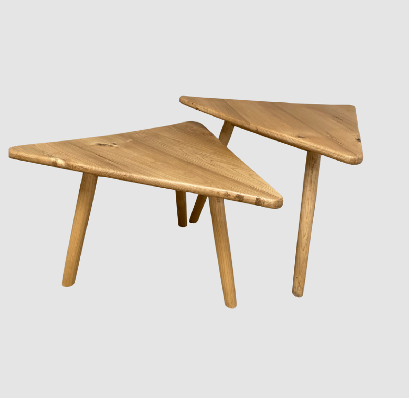 This stylish set of two triangular nesting tables features a modern “guitar pick” shape with smooth, rounded corners. Perfect for compact spaces or layered décor in contemporary interiors.