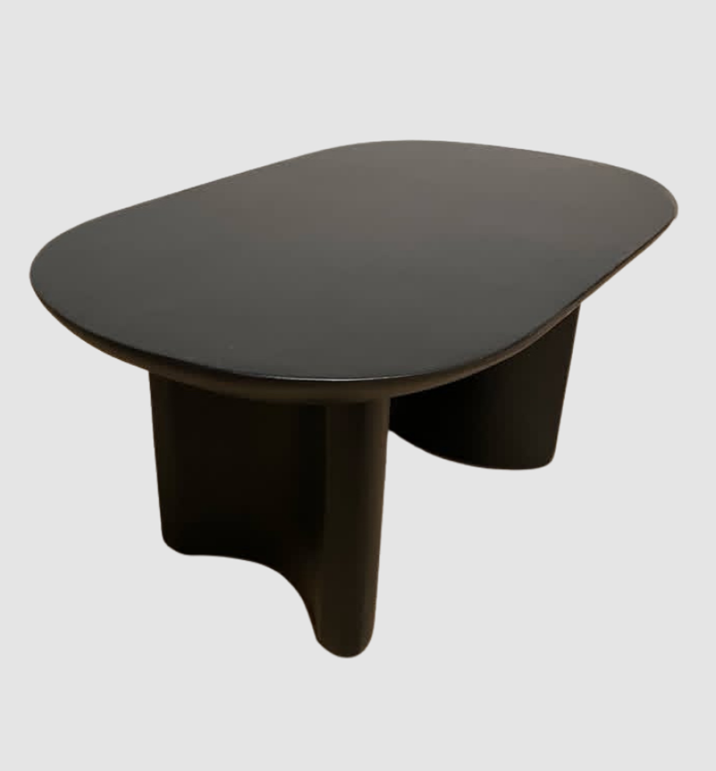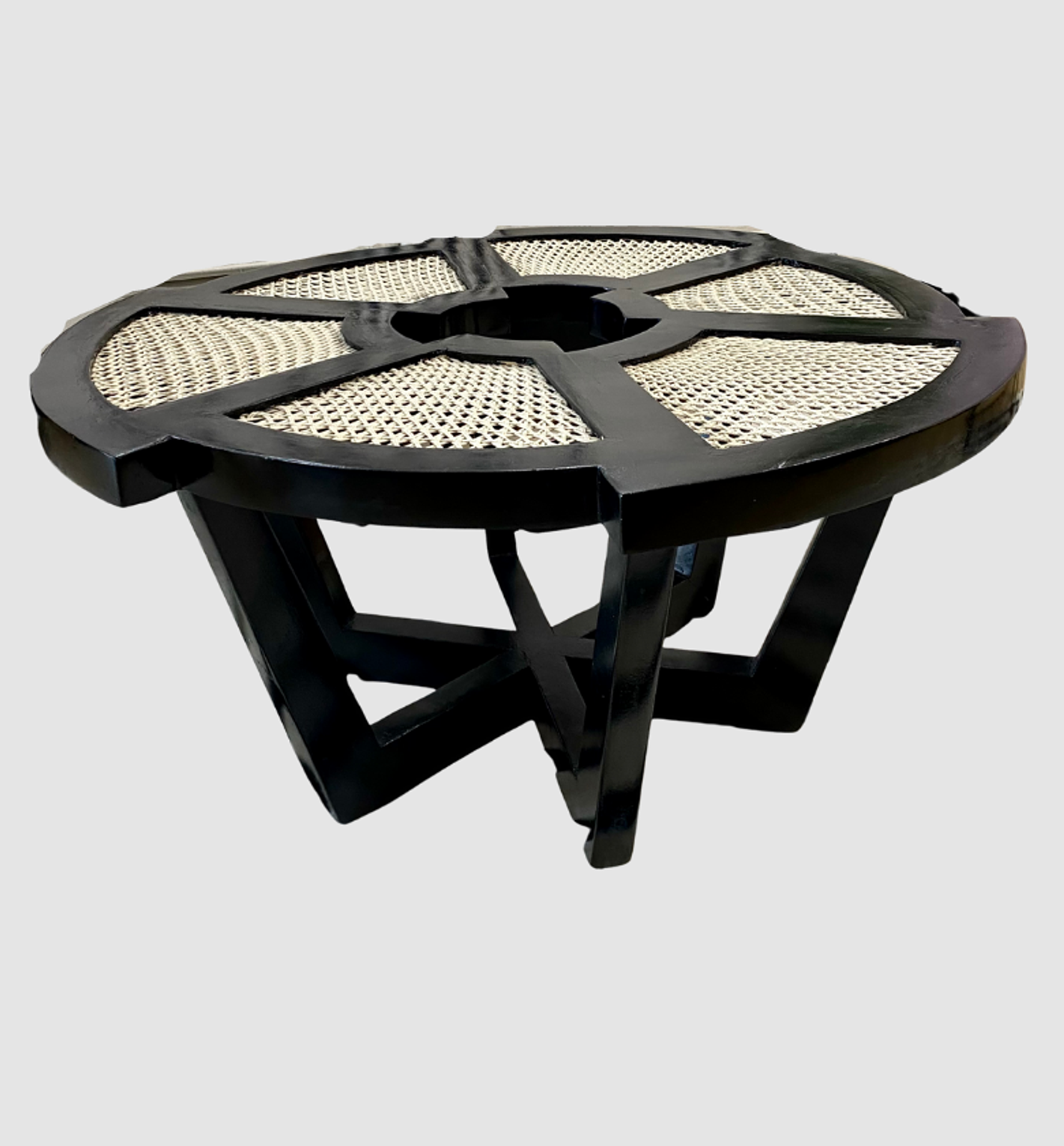 This striking black coffee table features a luxurious woven rattan top that introduces natural texture to its bold, modern form. Its unique, abstract base transforms this piece from simple utility into a captivating sculptural focal point for any living space.