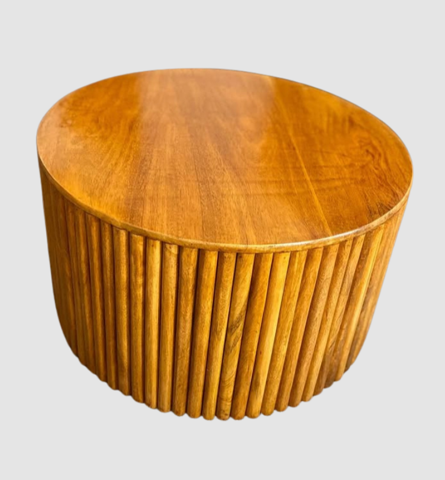 This eye-catching coffee table features a richly-toned natural wood top supported by a dramatically textured base. The unique, vertically fluted drum design introduces captivating depth and warmth, making it a powerful centerpiece in any contemporary or rustic setting.