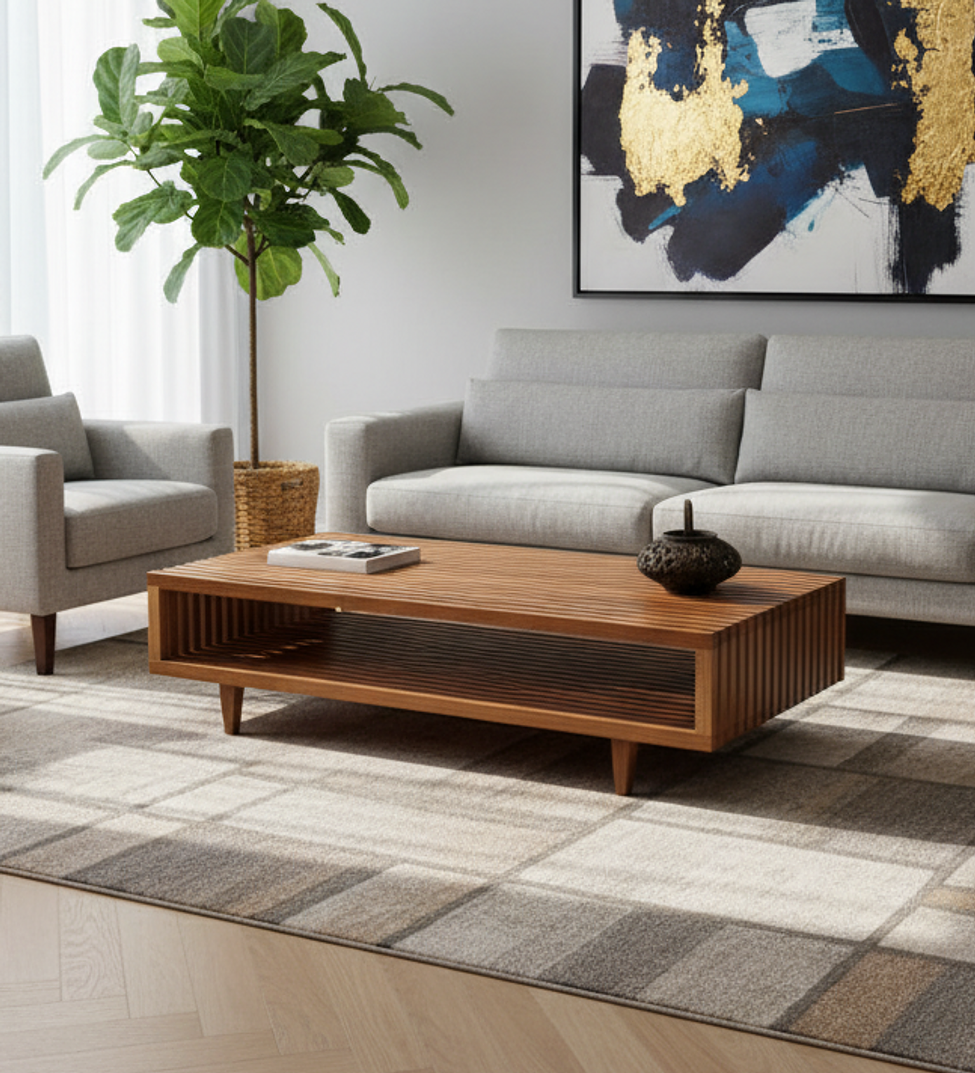 A sleek rectangular table crafted from thin, evenly spaced wooden slats, offering a refined balance of texture, form, and functionality.