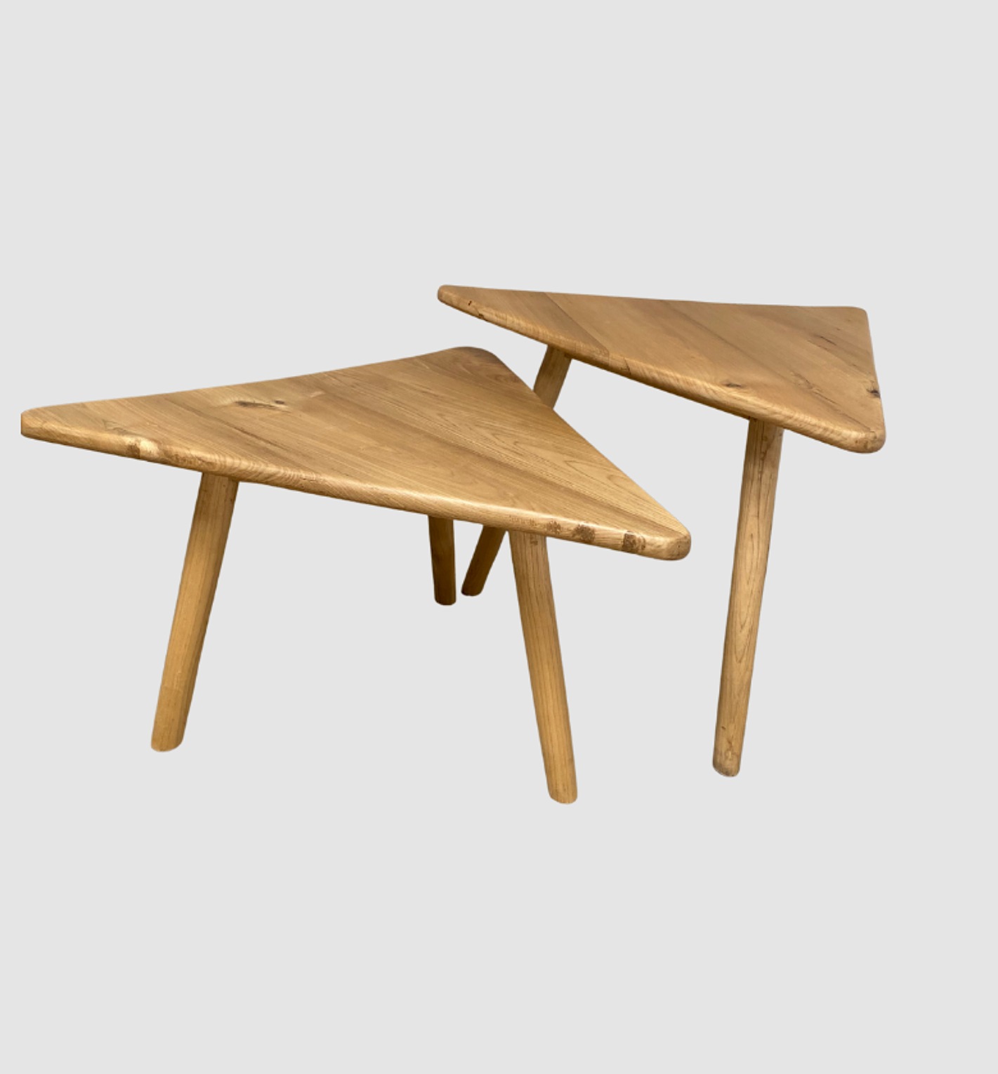 This stylish set of two triangular nesting tables features a modern “guitar pick” shape with smooth, rounded corners. Perfect for compact spaces or layered décor in contemporary interiors.